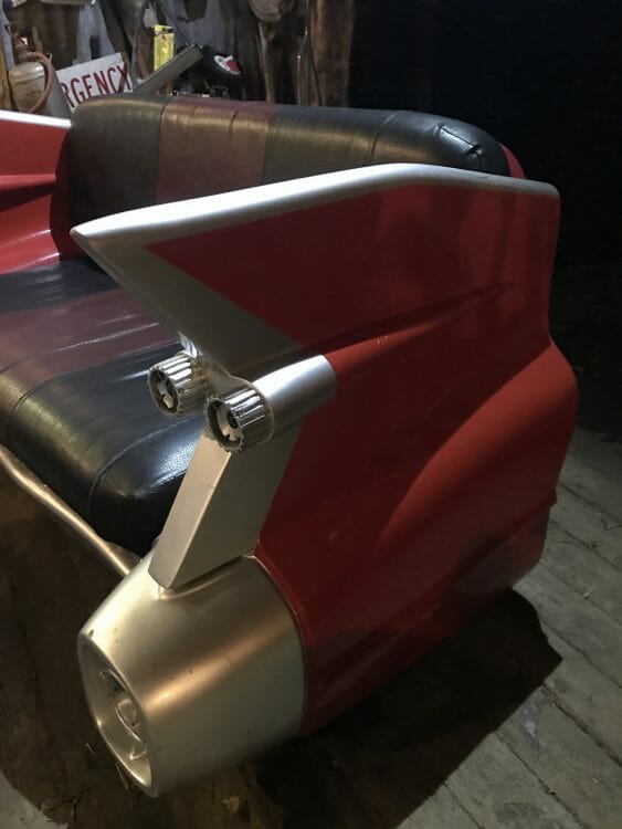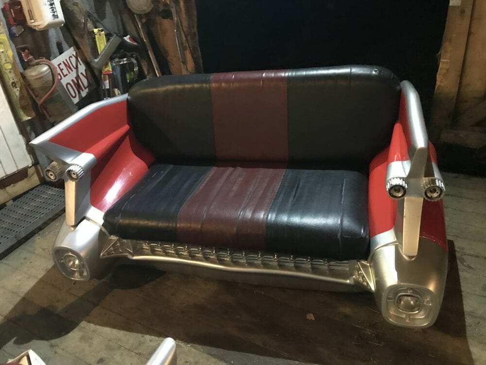 Musta sohva johon asennettu ei alkuperäiset takalamput. Siisti ja hyvä istua