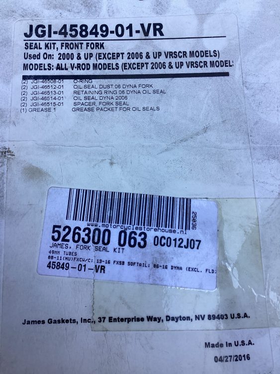 James fork seal rebuild kit. 49mm fork tubes 18-23 Softail (excl. upside down forks); 06-17 Dyna (excl. 2017 FXDLX; 12-16 FLD); 08-11 FXCW/C Rockers; 13-17 FXSB Breakout; 14-23 Touring; 14-23 Trikes; 16-22 1200X Forty Eight; 16-20 XL1200XS Forty Eight Special