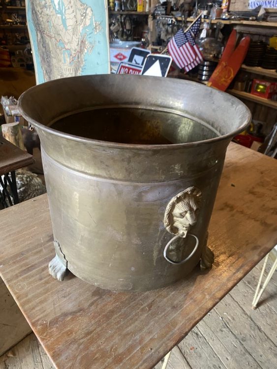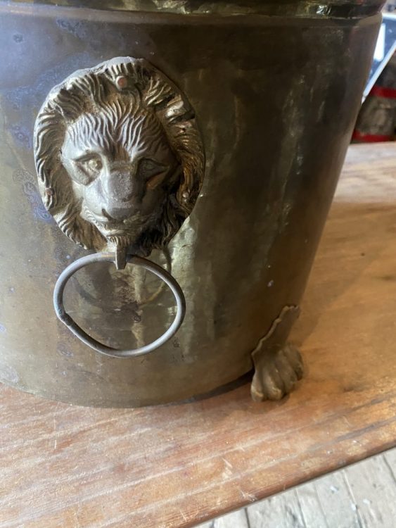 Iso messinki saavi kanto kahvoilla joita koristaa leijonan päät. Saavi irti maasta tassuilla. K390 H450 Monta käyttötarkoitusta mielikuvitus rajana esim. polttopuille you name it