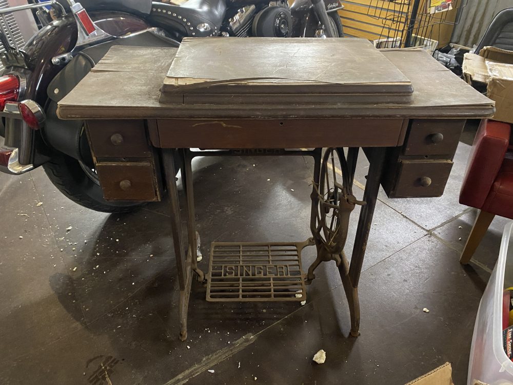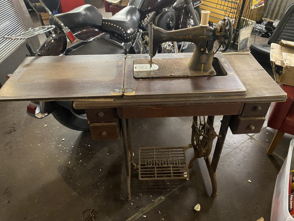 Amerikasta asti roudattu Singer ompelukone. Laatikoissa vanhoja lankoja, nappeja jne.. jaloissa näyttäisi olevan eroa kotimaiseen verrattuna?
